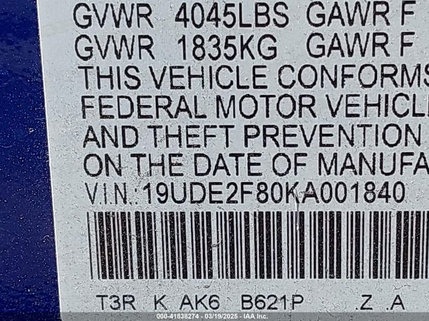Color BlueCylinders 4Drive Front wheel driveVIN 19UDE2F80KA******State Run & Drive VerifiedDamage Back AutoRIA