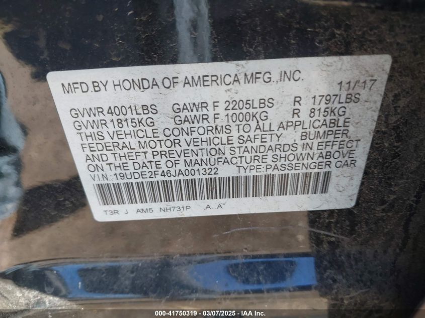 Color BlackCylinders 4Drive Front wheel driveVIN 19UDE2F46JA******State Run & Drive VerifiedDamage Left side AutoRIA