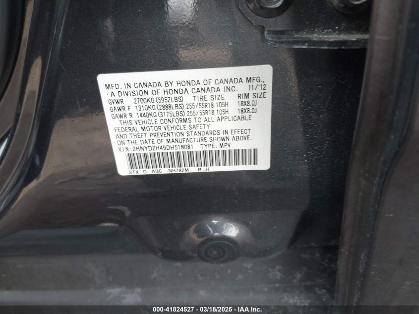 Color BlackCylinders 6Drive Full driveVIN 2HNYD2H49DH******State Run & Drive VerifiedDamage Rear leftAuction date 2025-03-25 AutoRIA