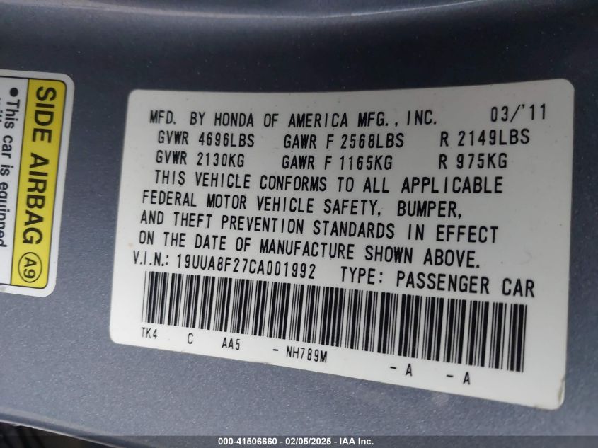 Color GrayCylinders 6Drive Front wheel driveVIN 19UUA8F27CA******State Run & Drive VerifiedDamage Right side