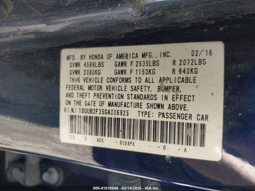 Color BlueCylinders 6Drive Front wheel driveVIN 19UUB2F35GA******State Run & Drive VerifiedDamage WaterAuction date 2025-03-21 AutoRIA