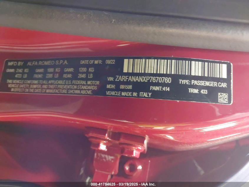 2023 ALFA ROMEO GIULIA 2023 Gasoline, 2.0, Full drive, VIN - ZARFANANXP7****** from the USA