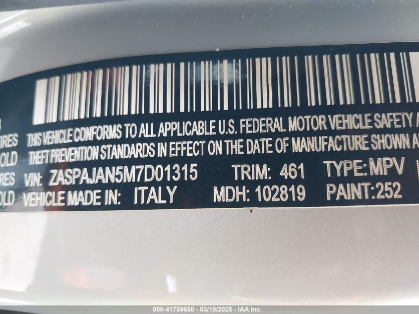 Color SilverCylinders 4Drive UnknownVIN ZASPAJAN5M7******State Run & Drive VerifiedDamage WaterAuction date 2025-03-20 AutoRIA