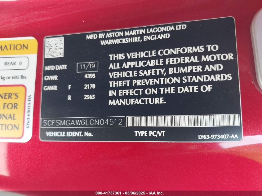 2020 ASTON MARTIN VANTAGE 2020 Gasoline, 4.0, Rear wheel drive, VIN - SCFSMGAW6LG****** from the USA