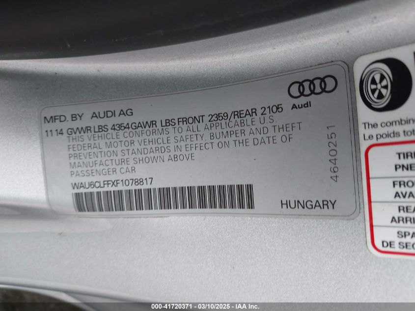 Color SilverCylinders 4Drive Front wheel driveVIN WAU6CLFFXF1******State Run & Drive VerifiedDamage Front left AutoRIA