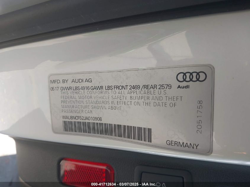 Color WhiteCylinders 4Drive Full driveVIN WAUBNCF52JA******State Run & Drive VerifiedDamage Front rightAuction date 2025-03-24 AutoRIA