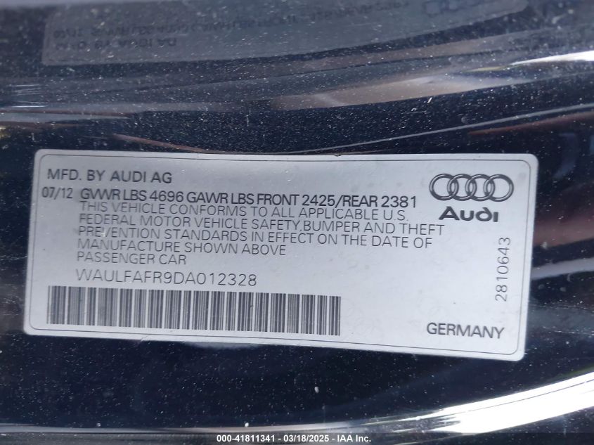 Color BlackCylinders 4Drive Full driveVIN WAULFAFR9DA******State Run & Drive VerifiedDamage Front or backAuction date 2025-03-20 AutoRIA