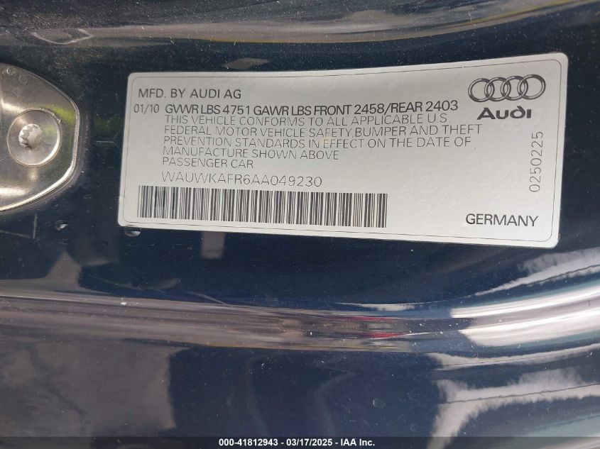 2010 AUDI A5 2010 Gasoline, 3.2, Full drive, VIN - WAUWKAFR6AA****** from the USA