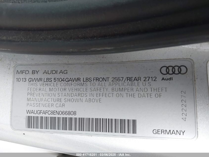 Color SilverCylinders 4Drive Full driveVIN WAUGFAFC8EN******State Run & Drive VerifiedDamage Front or backAuction date 2025-03-25 AutoRIA