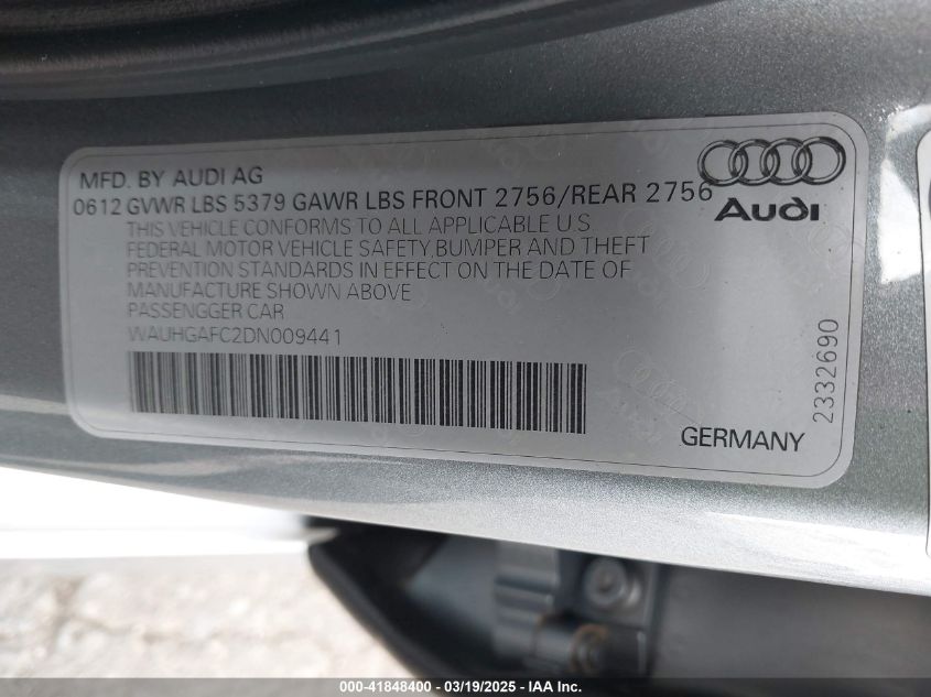 Color GrayCylinders 6Drive Full driveVIN WAUHGAFC2DN******State Run & Drive VerifiedDamage InsignificantAuction date 2025-03-20 AutoRIA