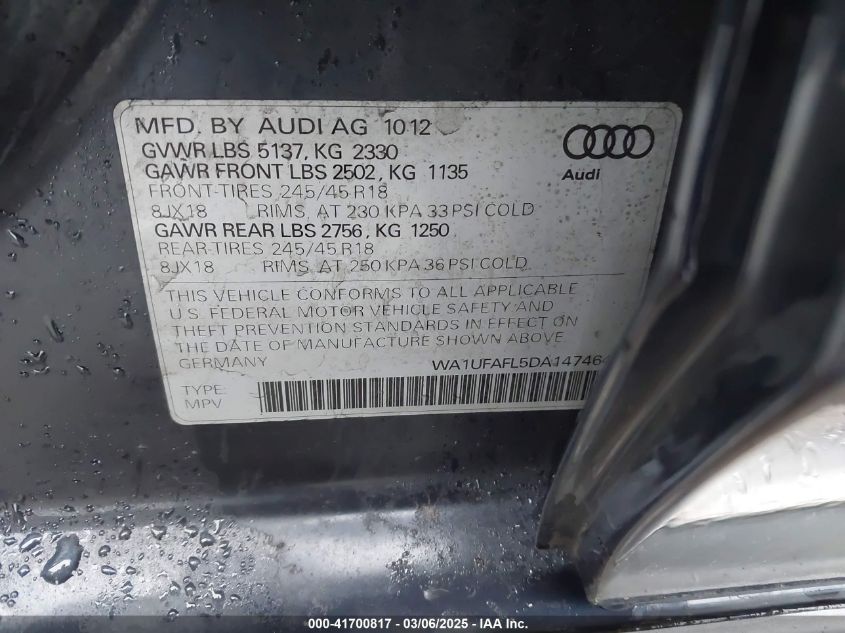 Color GrayCylinders 4Drive Full driveVIN WA1UFAFL5DA******State Run & Drive VerifiedDamage Front or backAuction date 2025-03-21