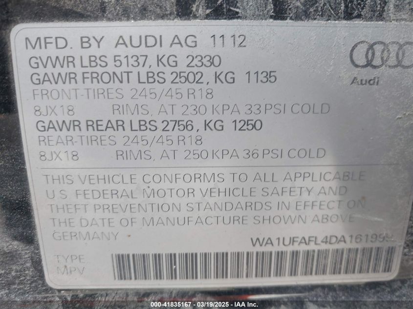 Color BlackCylinders 4Drive Full driveVIN WA1UFAFL4DA******State Run & Drive VerifiedDamage Insignificant