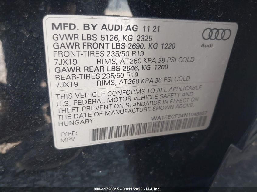 2022 AUDI Q3 2022 Gasoline, 2.0, Full drive, VIN - WA1EECF34N1****** from the USA
