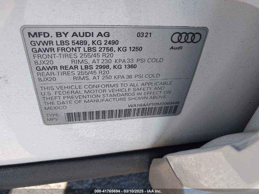 2021 AUDI Q5 2021 Gasoline, 2.0, Full drive, VIN - WA1BAAFY0M2****** from the USA
