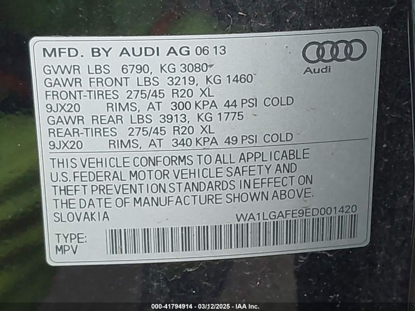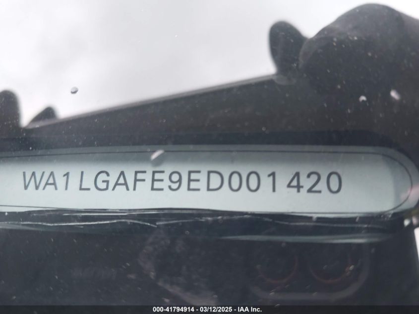 Color BlackCylinders 6Drive Full driveVIN WA1LGAFE9ED******State Run & Drive VerifiedDamage InsignificantAuction date 2025-03-26 AutoRIA