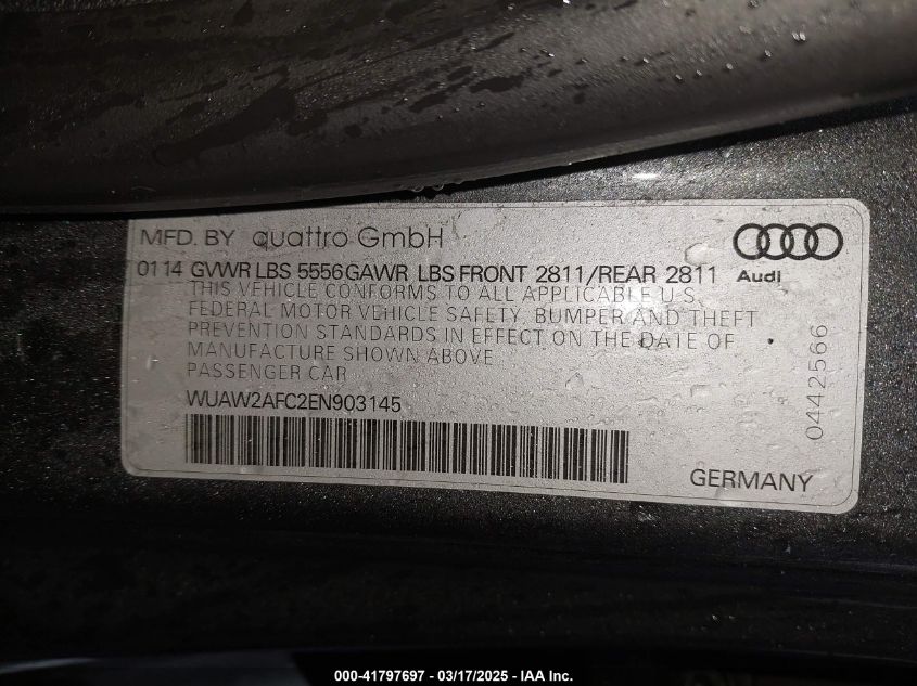 Color GrayCylinders 8Drive Full driveVIN WUAW2AFC2EN******State Run & Drive VerifiedDamage Front or back