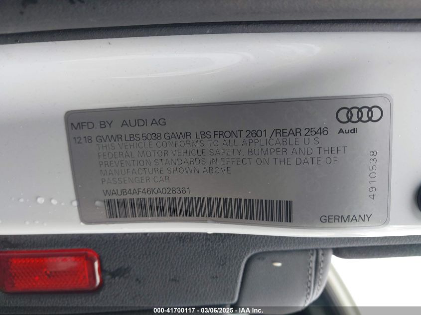 2019 AUDI S4 2019 Gasoline, 3.0, Full drive, VIN - WAUB4AF46KA****** from the USA