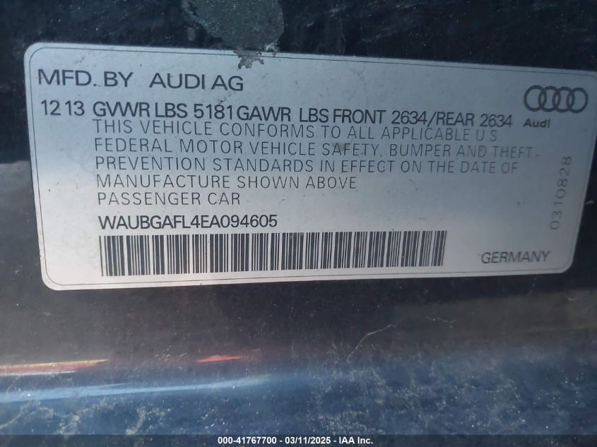 Color BlackCylinders 6Drive Full driveVIN WAUBGAFL4EA******State Run & Drive VerifiedDamage Left side AutoRIA