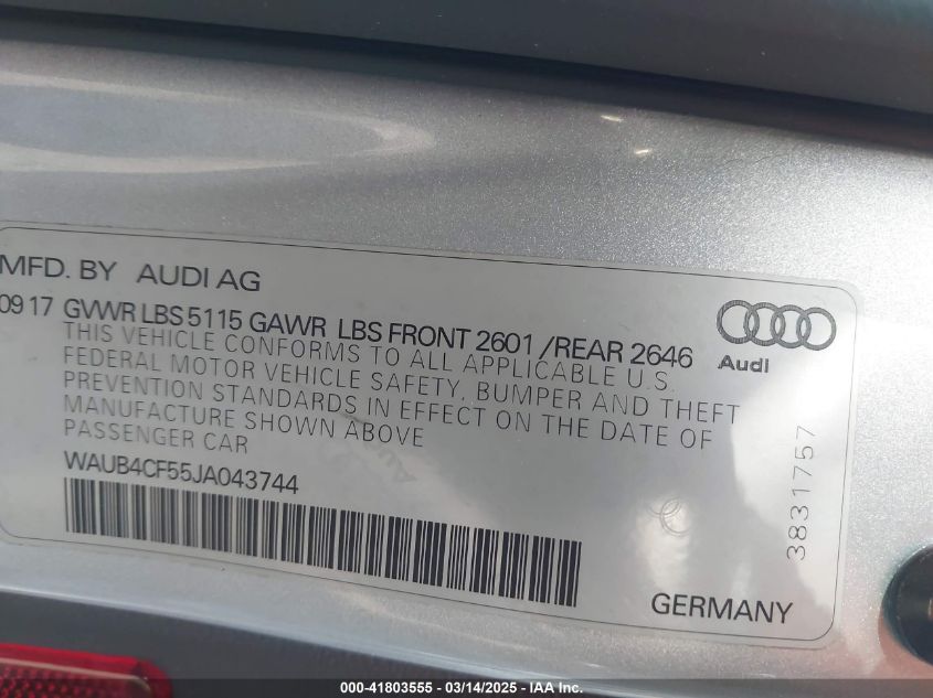 2018 AUDI S5 2018 Gasoline, 3.0, Full drive, VIN - WAUB4CF55JA****** from the USA