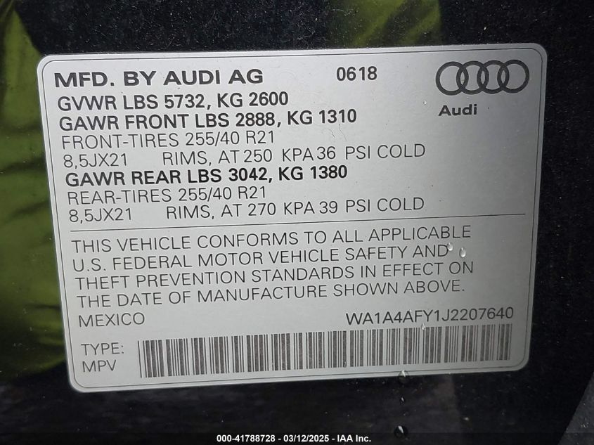Color BlackCylinders 6Drive Full driveVIN WA1A4AFY1J2******State Run & Drive VerifiedDamage MotorAuction date 2025-03-26 AutoRIA