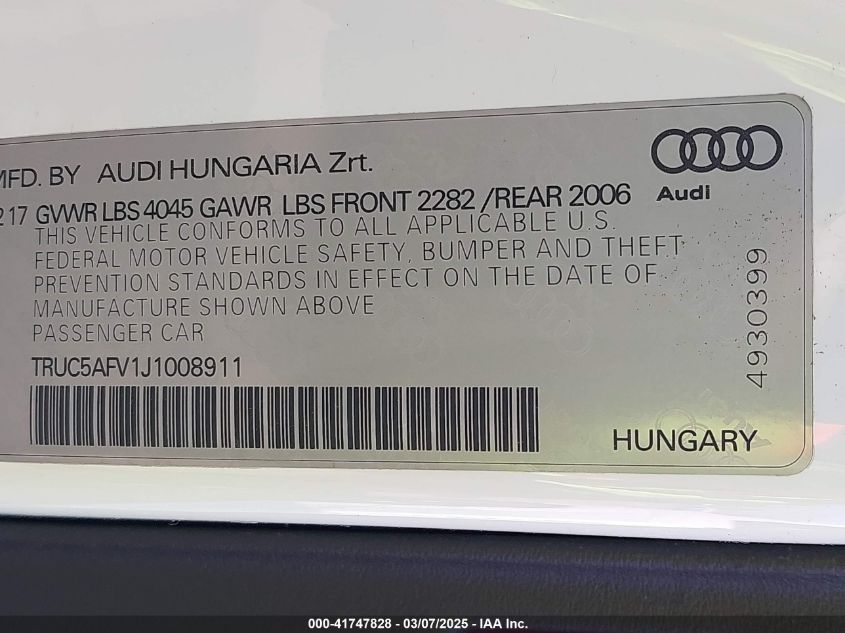 2018 AUDI TT 2018 Gasoline, 2.0, Full drive, VIN - TRUC5AFV1J1****** from the USA