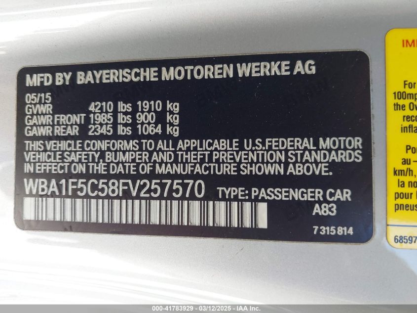 2015 BMW 2 SERIES 2015 Gasoline, 2.0, Rear wheel drive, VIN - WBA1F5C58FV****** from the USA