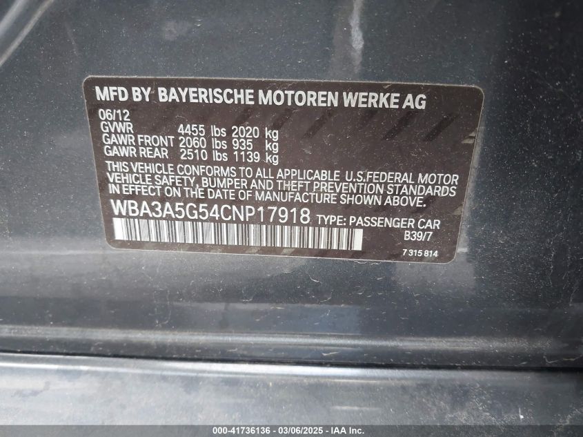 Color GrayCylinders 4Drive Rear wheel driveVIN WBA3A5G54CN******State Run & Drive VerifiedDamage InsignificantAuction date 2025-03-20 AutoRIA