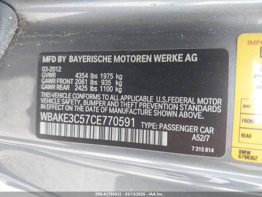 2012 BMW 3 SERIES 2012 Gasoline, 3.0, Rear wheel drive, VIN - WBAKE3C57CE****** from the USA