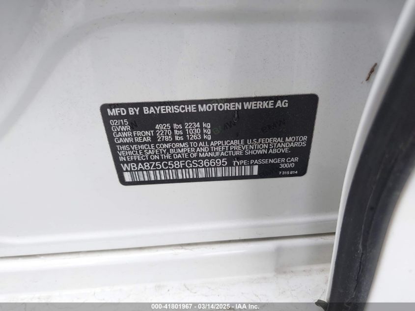 Color WhiteCylinders 4Drive Full driveVIN WBA8Z5C58FG******State Run & Drive VerifiedDamage Front or backAuction date 2025-03-21 AutoRIA
