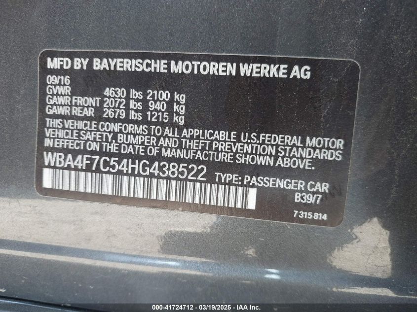 2017 BMW 4 SERIES 2017 Gasoline, 2.0, Rear wheel drive, VIN - WBA4F7C54HG****** from the USA