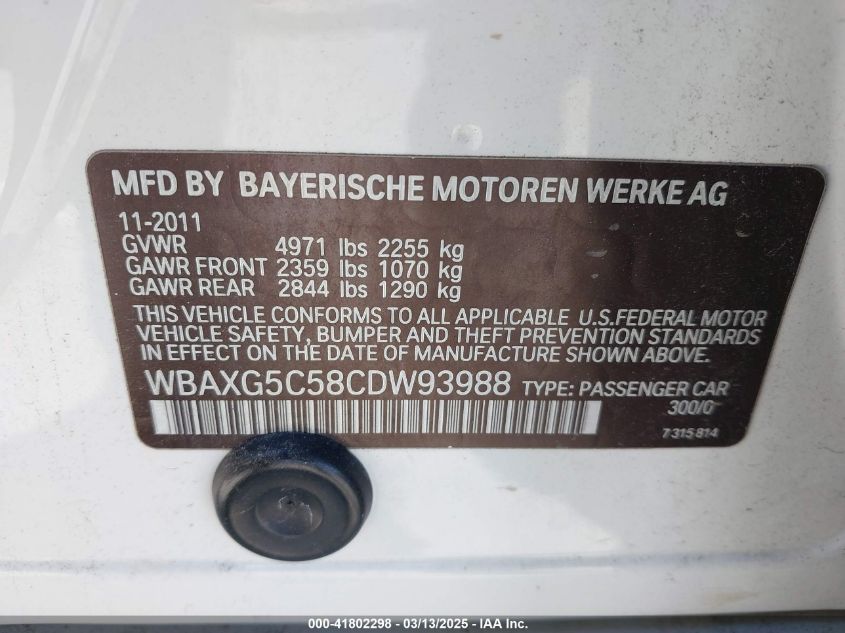 2012 BMW 5 SERIES 2012 Gasoline, 2.0, Rear wheel drive, VIN - WBAXG5C58CD****** from the USA