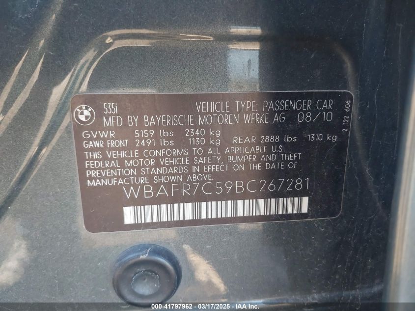 2011 BMW 5 SERIES 2011 Gasoline, 3.0, Rear wheel drive, VIN - WBAFR7C59BC****** from the USA