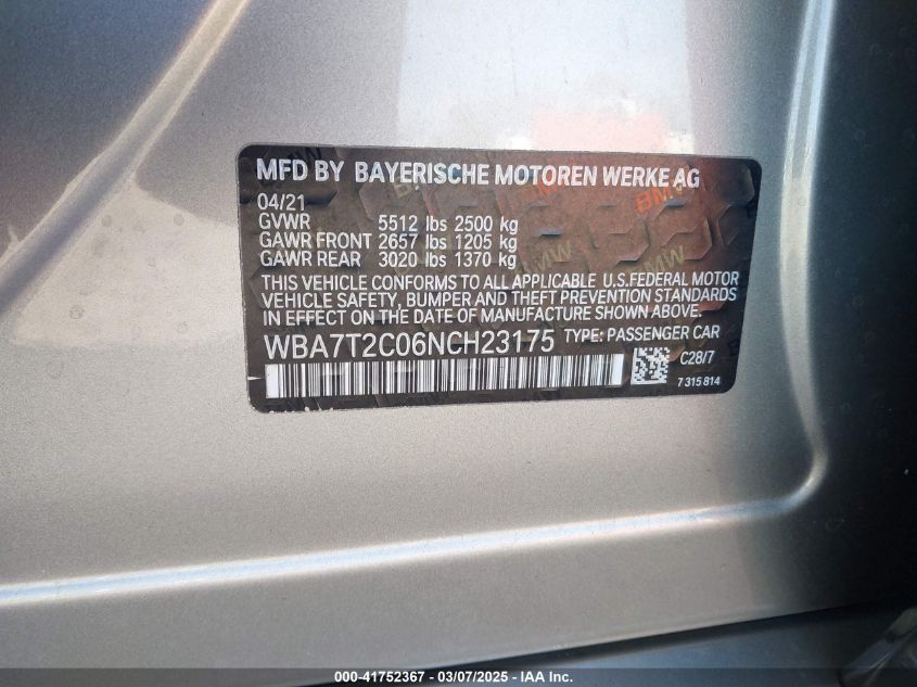 2022 BMW 7 SERIES 2022 Gasoline, 3.0, Rear wheel drive, VIN - WBA7T2C06NC****** from the USA