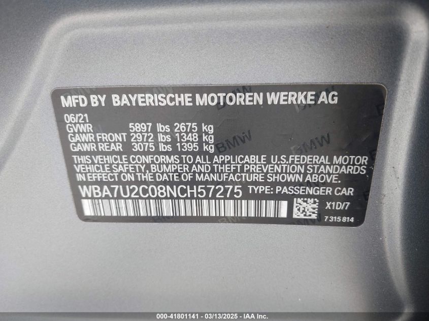 2022 BMW 7 SERIES 2022 Gasoline, 4.4, Full drive, VIN - WBA7U2C08NC****** from the USA
