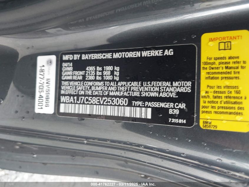 Color GrayCylinders 6Drive Rear wheel driveVIN WBA1J7C58EV******State Run & Drive VerifiedDamage Front right