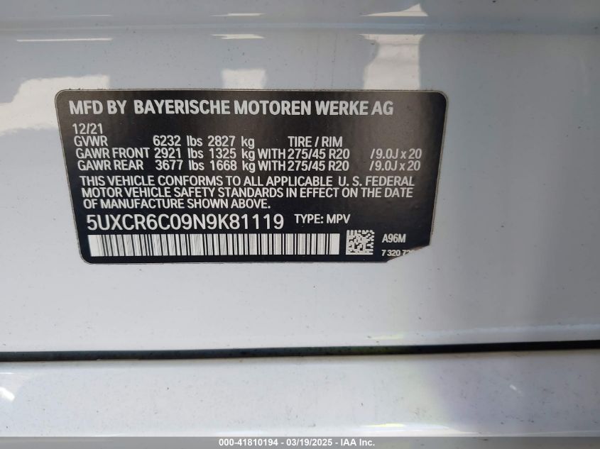 2022 BMW X5 2022 Gasoline, 3.0, Full drive, VIN - 5UXCR6C09N9****** from the USA