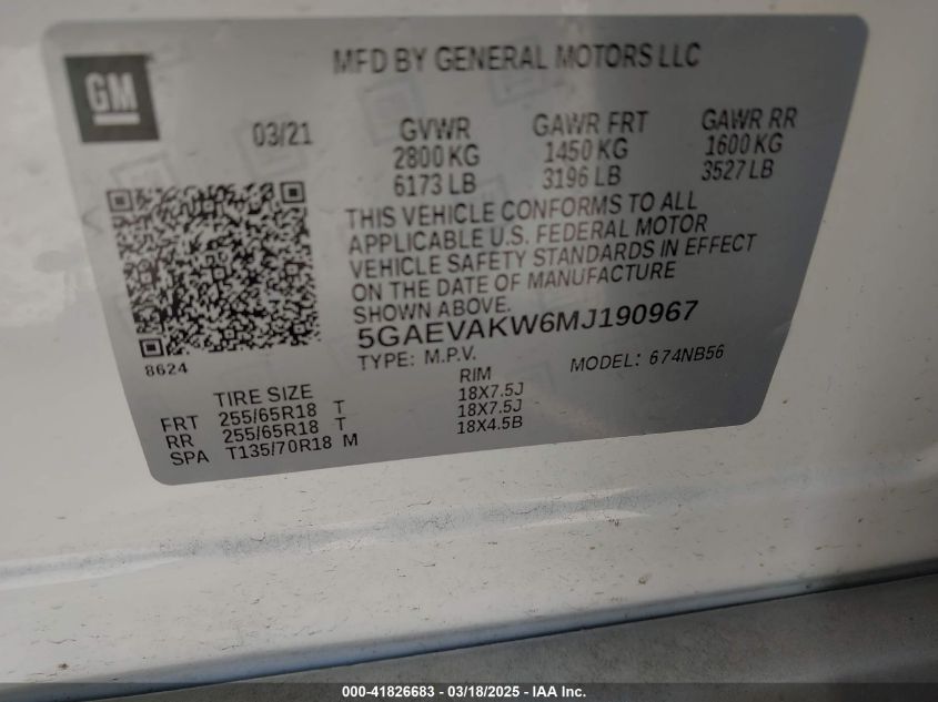Color WhiteCylinders 6Drive Full driveVIN 5GAEVAKW6MJ******State Run & Drive VerifiedDamage Back