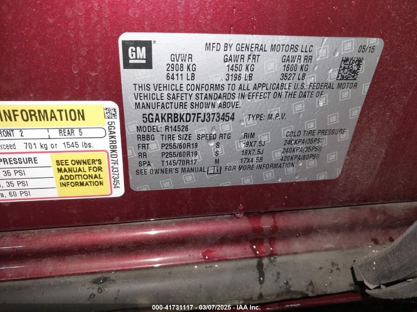 Color RedCylinders 6Drive Front wheel driveVIN 5GAKRBKD7FJ******State Run & Drive VerifiedDamage Front rightAuction date 2025-03-20 AutoRIA