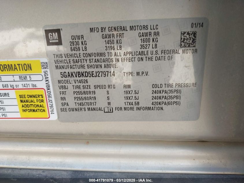 Color SunburnCylinders 6Drive Full driveVIN 5GAKVBKD5EJ******State Run & Drive VerifiedDamage BackAuction date 2025-03-20 AutoRIA