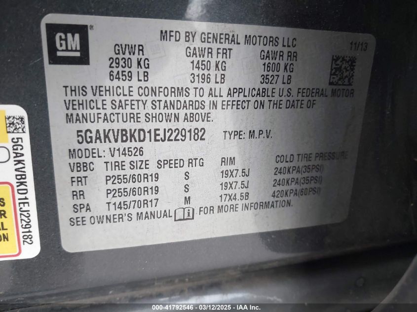 Color GrayCylinders 6Drive Full driveVIN 5GAKVBKD1EJ******State Run & Drive VerifiedDamage Right sideAuction date 2025-03-24 AutoRIA