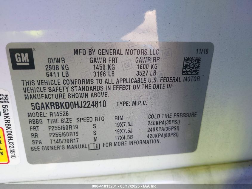 Color WhiteCylinders 6Drive Front wheel driveVIN 5GAKRBKD0HJ******State Run & Drive VerifiedDamage Front or back AutoRIA