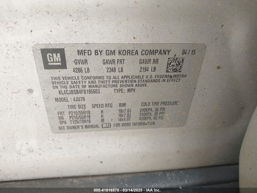 Color SilverCylinders 4Drive Front wheel driveVIN KL4CJBSB4FB******State Run & Drive VerifiedDamage Front leftAuction date 2025-03-21 AutoRIA