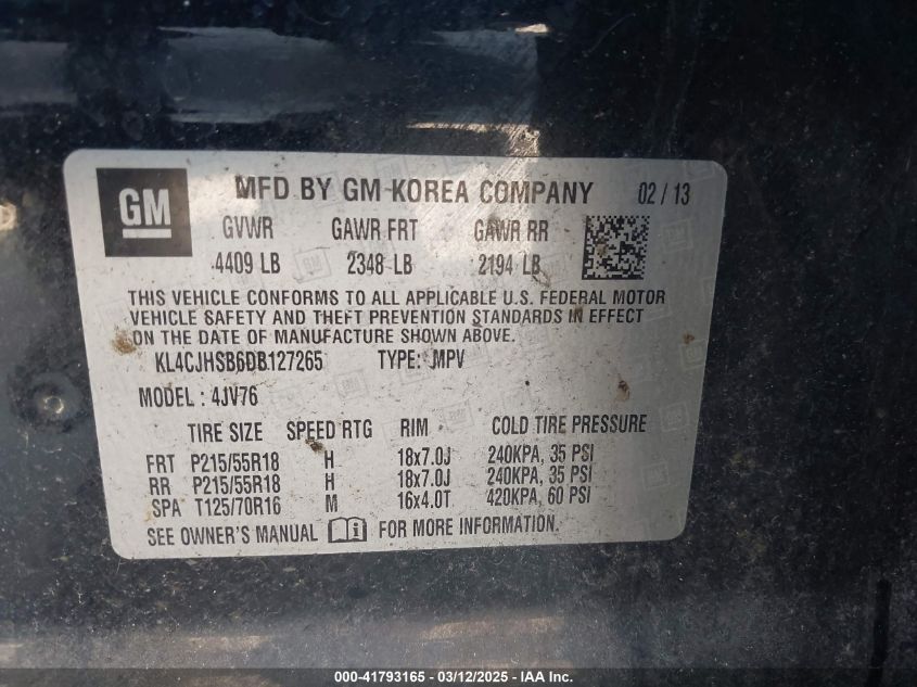 Color BlackCylinders 4Drive Full driveVIN KL4CJHSB6DB******State Run & Drive VerifiedDamage Rear leftAuction date 2025-03-20 AutoRIA