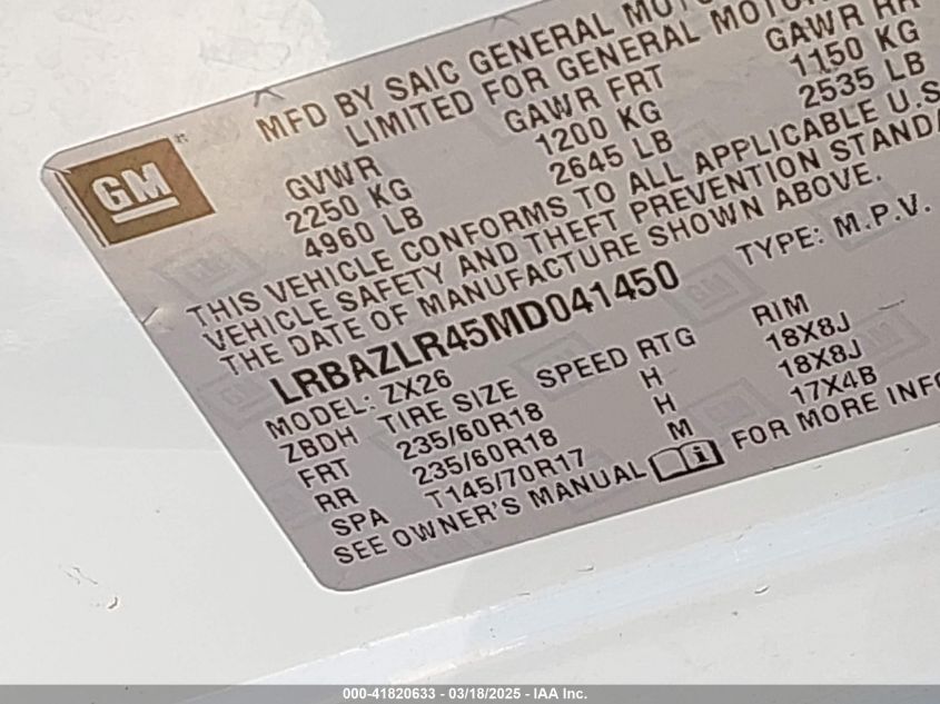 Color WhiteCylinders 4Drive Front wheel driveVIN LRBAZLR45MD******State Run & Drive VerifiedDamage Front right AutoRIA