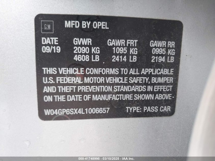 Color SilverCylinders 4Drive Front wheel driveVIN W04GP6SX4L1******State Run & Drive VerifiedDamage Front or backAuction date 2025-03-25