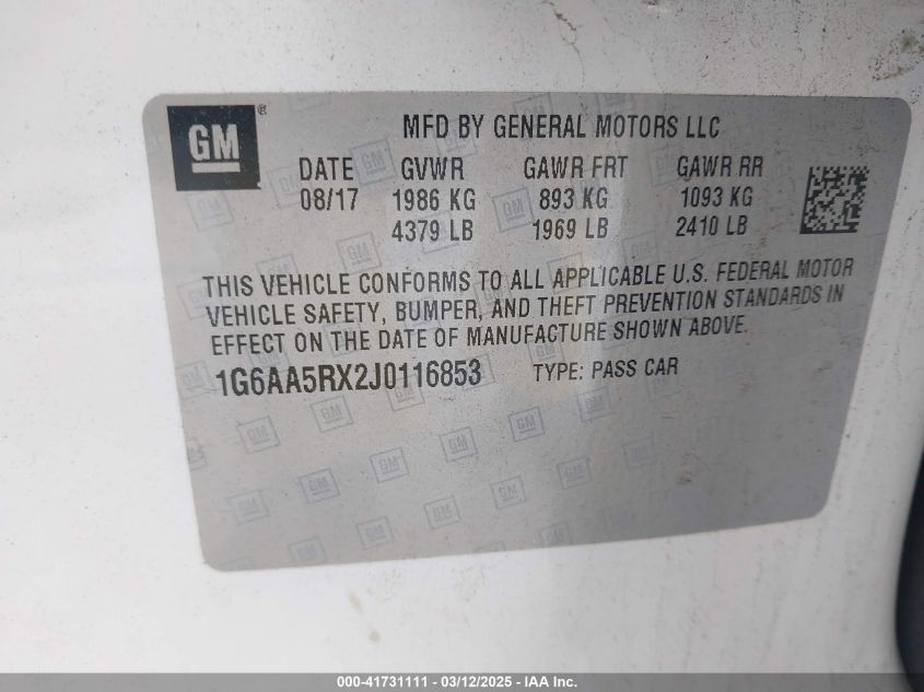 Color WhiteCylinders 4Drive Rear wheel driveVIN 1G6AA5RX2J0******State Run & Drive VerifiedDamage Rear leftAuction date 2025-03-27 AutoRIA