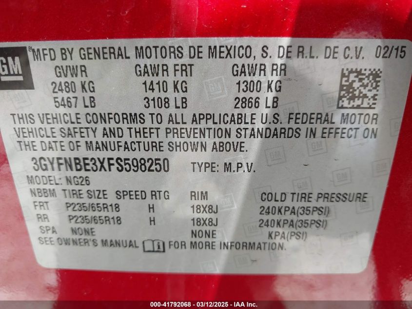 Color RedCylinders 6Drive Front wheel driveVIN 3GYFNBE3XFS******State Run & Drive VerifiedDamage WaterAuction date 2025-03-20 AutoRIA