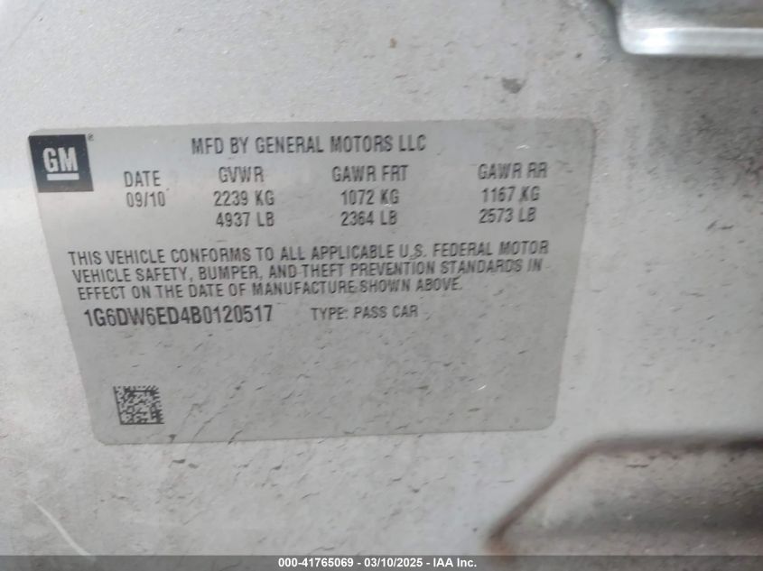 Color SilverCylinders 6Drive Rear wheel driveVIN 1G6DW6ED4B0******State Run & Drive VerifiedDamage Left side