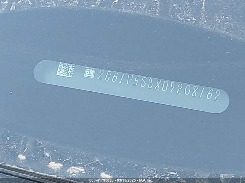 Color BlackCylinders 6Drive Front wheel driveVIN 2G61P5S38D9******State Run & Drive VerifiedDamage All over the carAuction date 2025-03-21