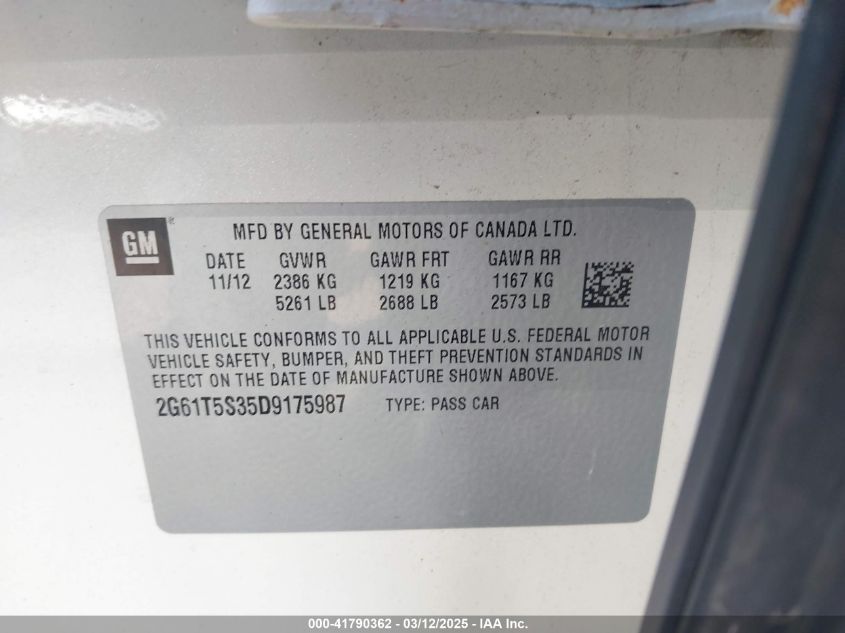 Color WhiteCylinders 6Drive Full driveVIN 2G61T5S35D9******State Run & Drive VerifiedDamage Front leftAuction date 2025-03-20